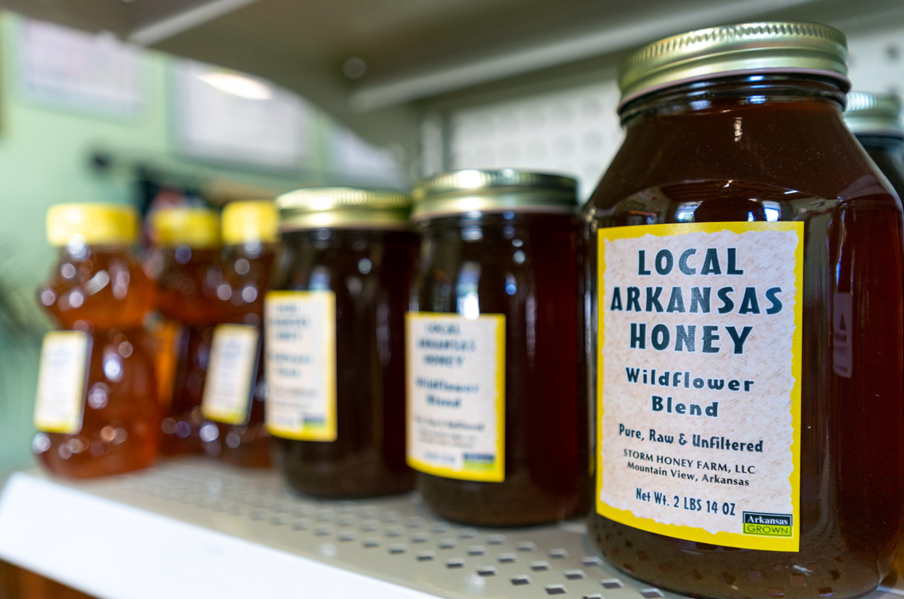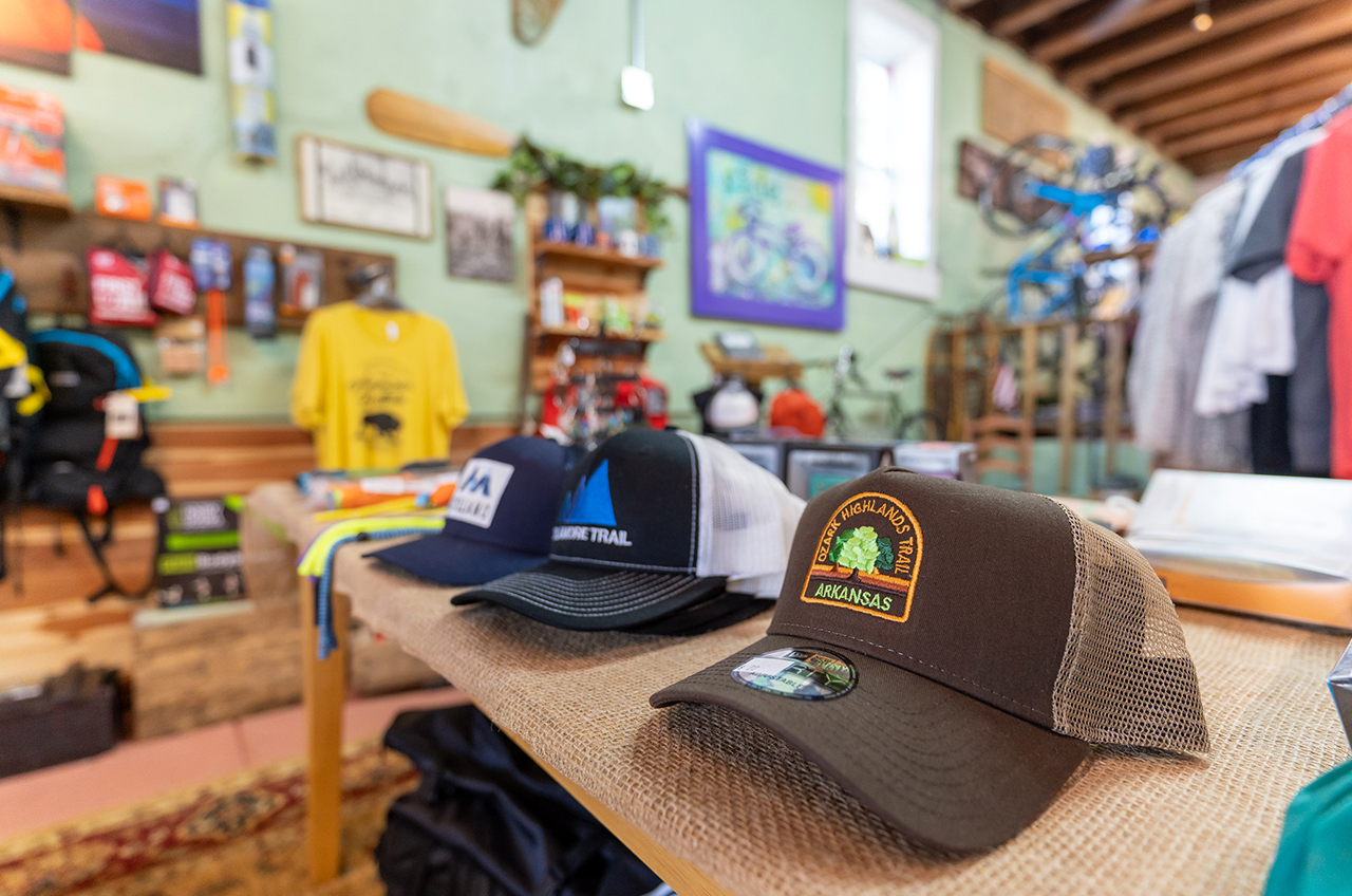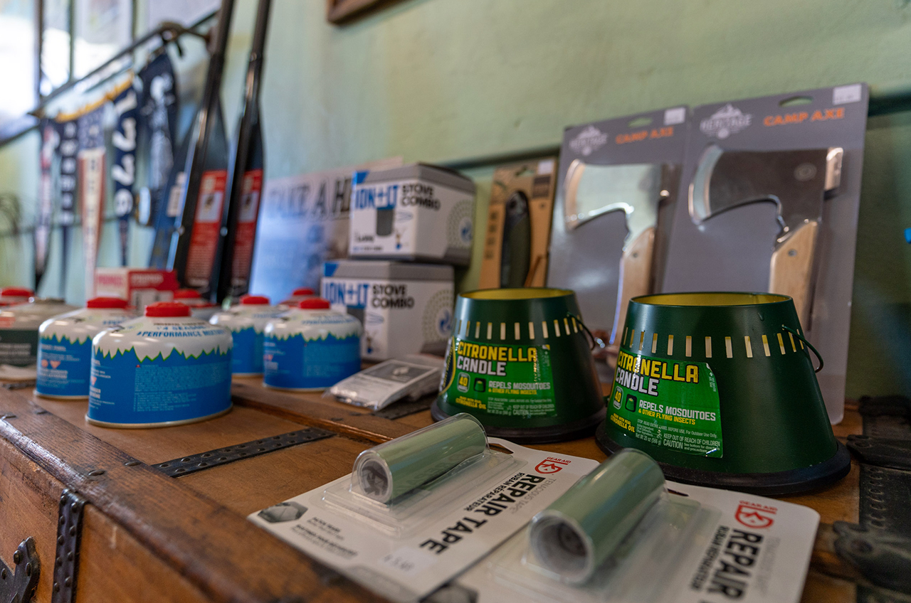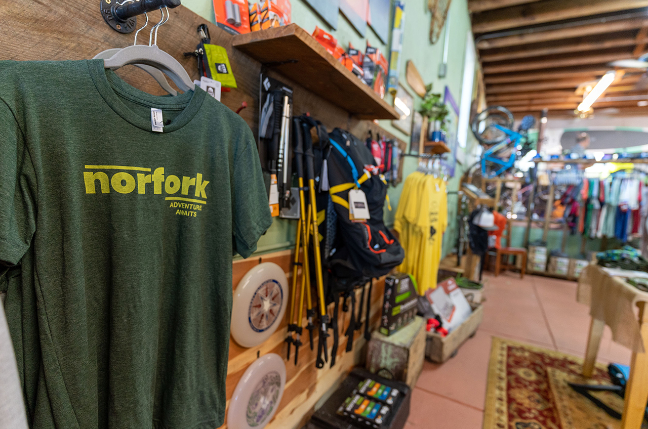 Before arriving at Norfork Adventure Supply, you are greeted by a colorful mural on a rock wall painted by local artist and owner of Borderline Supply, Co., Christopher Royer. As you round the corner a hanging wooden sign reading, "Norfork Adventure Supply, est. 2018” hovers over the front railing of our destination. The stone building is monstrous, decorated with bright yellow columns and trim. It would be impossible to miss if you were just passing through.